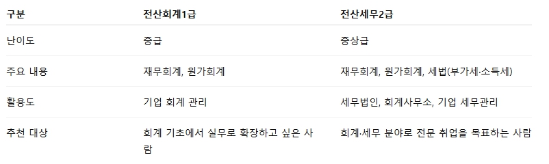 전산회계1급 → 전산세무2급 → 전산세무1급 순으로 단계별 목표를 세우면 경력 개발에 도움이 됩니다.